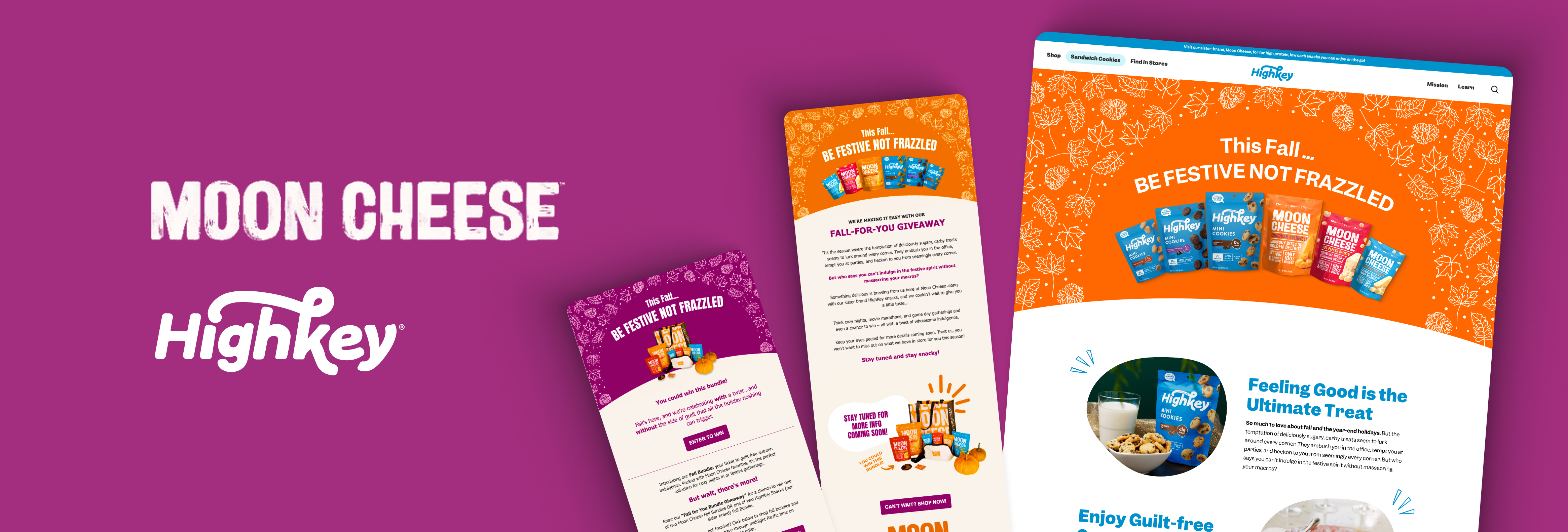 Designed coordinated holiday landing pages for sibling brands Moon Cheese and HighKey to improve click-through rates and support the brand’s eCommerce goals—balancing unified visuals with distinct brand personalities.